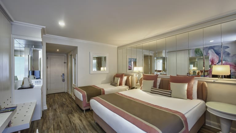 Standart Zimmer (26 – 30 m2): 1 Schlafzimmer mit 1 Frenchbett, 1 Einzelbett, 1 Sofa, Dusche / WC, Klimaanlage (zentral + stundenweise), Haartrockner, Direktwahltelefon, LCD TV (Satelliten- und Musikempfang), Safe, Minibar, Laminatboden, Wasserkocher, Tee und Kaffee. Jeden Tag Zimmerreinigung und Wechsel von Badetuch. Wechsel von Bettlacken jeden zweiten Tag einmal, Balkon, Zimmerlage: als Landseite, Meerblick oder seitlicher Meerblick (Unterkunft: 3 Erwachsene +1 Kind oder 2 Erwachsene + 2 Kinder). Behindertengerechte Zimmer (26 m²): wie die Standard Zimmer eingerichtet, Lage: in der Lobby Etage. Es gibt eine Notruftaste. Technische Details: die Tür: 93 cm, Balkontür: 75 cm, die Aufzugstür: 90 cm, Badezimmertür: 93 cm, Waschbecken Höhe: 81 cm, WC Höhe: 50 cm (Unterkunft: 2 Erwachsene oder 2 Erwachsene + 1 Kind), die Rezeption, Restaurants, Pools und der Strand sind mit dem Rollstuhl möglich zu erreichen. Duplex Familienzimmer (47 m2): 2 Schlafzimmer, 1. Etage: 1 Frenchbett + Einzelbett (Dusche / WC), 2. Etage: 1 Frenchbett (Dusche / WC), Klimaanlage (zentral + stundenweise), Haartrockner, Direktwahltelefon, LCD TV (Satelliten – und Musikempfang), Safe, Balkon, Minibar, Laminatboden, Wasserkocher, Tee und Kaffee. Jeden Tag Zimmerreinigung und Wechsel von Badetuch. Wechsel von Bettlacken jeden zweiten Tag einmal, (Unterkunft: 3 Erwachsene + 2 Kinder oder 4 Erwachsene + 1 Kind). Familien Zimmer (37 m2): 2 Schlafzimmer, 1 Frenchbett in einem Zimmer, im anderen Zimmer 2 Einzelbetten, Dusche / WC, Klimaanlage (zentral + stundenweise), Haartrockner, Direktwahltelefon, LCD TV (Satelliten- und Musikempfang), Safe, Minibar, Laminatboden, Wasserkocher, Tee und Kaffee. Jeden Tag Zimmerreinigung und Wechsel von Badetuch. Wechsel von Bettlacken jeden zweiten Tag einmal, Balkon (Unterkunft: 4 Erwachsene oder 3 Erwachsene + 1 Kind). Pink Moon Suite (80 m2): für Hochzeitspaare; ein rosa eingerichteter runder Raum mit Schlafzimmer für 2 Personen, Speisebereich, Klimaanlage (zentral + stundenweise), Haartrockner, Direktwahltelefon, LCD TV (Satelliten- und Musikempfang), DVD, Safe, Mini Bar, Laminatboden, Wasserkocher, Tee, Kaffee und Kaffeemaschine. Jeden Tag Zimmerreinigung und Wechsel von Badetuch. Wechsel von Bettlacken jeden zweiten Tag einmal, Jacuzzi, Dusche / WC, Panorama Fenster mit Meerblick, VIP Service (Unterkunft: 2 Erwachsene), kein Balkon. Deluxe Family Zimmer (85m2, mit 60 m2 Terrasse): Eingangsbereich, Jacuzzi, Dusche / WC, reiche Innenausstattung, Meerblick, Liegestühle auf der Terrasse, Klimaanlage (zentral + stundenweise), Haartrockner, Direktwahltelefon, LCD TV (Satelliten- und Musikempfang), Safe, Minibar, Laminatboden, Wasserkocher, Tee, Kaffee und Kaffeemaschine. Jeden Tag Zimmerreinigung und Wechsel von Badetuch. Wechsel von Bettlacken jeden zweiten Tag einmal, VIP Service, in einem Bereich: 1 Frenchbett + 1 Single Bett, im anderen Bereich: 1 Frenchbett + 1 Josefin (Unterkunft max. 5+1 (infant) möglich). Presidential Suite (108 m2 mit 60 m2Terrasse): Eingangsbereich, WC, Schlafzimmer, Bar, Dusche / WC, Jakuzzi, Klimaanlage (zentral + stundenweise), Haartrockner, Direktwahltelefon, LCD TV (Satelliten- und Musikempfang), Safe, Laminatboden, Wasserkocher, Tee, Kaffee und Kaffeemaschine, Jeden Tag Zimmerreinigung und Wechsel von Badetuch. Wechsel von Bettlacken jeden zweiten Tag einmal, VIP Service (Unterkunft max. 2+1 möglich). K1 Suite (80 m2): ein grosser, runder Raum mit zwei Frenchbetten und Sitzgruppe, Jacuzzi, Dusche / WC, Panoramablick aufs Meer, LCD TV (Satelliten- und Musikempfang), Haartrockner, Direktwahltelefon, Safe, Minibar, Laminatboden, Wasserkocher, Tee, Kaffee und Kaffeemaschine. Jeden Tag Zimmerreinigung und Wechsel von Badetuch. Wechsel von Bettlacken jeden zweiten Tag einmal, VIP Service, (Unterkunft: 2 Erwachsene), kein Balkon vorhanden. K2 Suite (80 m2): ein grosser, runder Raum mit zwei Frenchbetten und Sitzgruppe, Dusche / WC, Panoramablick aufs Meer, LCD TV (Satelliten- und Musikempfang), Haartrockner, Direktwahltelefon, Safe, Minibar, Laminatboden, Wasserkocher, Tee, Kaffee und Kaffeemaschine. Jeden Tag Zimmerreinigung und Wechsel von Badetuch. Wechsel von Bettlacken jeden zweiten Tag einmal, VIP Service, (Unterkunft: 2 Erwachsene), kein Balkon vorhanden. Black Suite (80 m2): ein in schwarz gehaltener, grosser, runder Raum mit Frenchbett, Sitzgruppe, Jakuzzi, WC, Panoramablick aufs Meer, Klimaanlage (zentral + stundenweise), Haartrockner, Direktwahltelefon, LCD TV (Satelliten- und Musikempfang), Safe, Minibar, Fliesen, Wasserkocher, Tee, Kaffee, Kaffeemaschine. Jeden Tag Zimmerreinigung und Wechsel von Badetuch. Wechsel von Bettlacken jeden zweiten Tag einmal, VIP Service (Unterkunft: 2 Erwachsene), kein Balkon vorhanden.